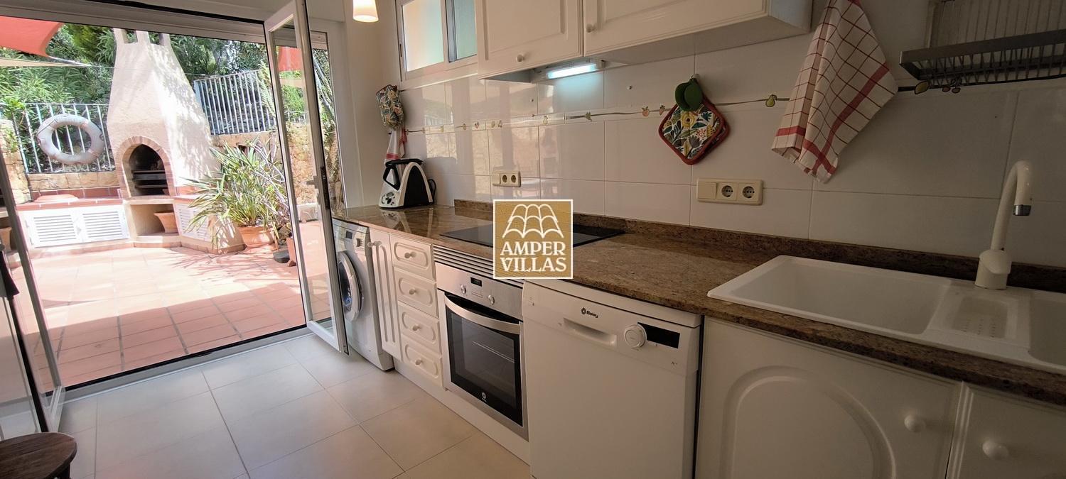 Chalet adosado de esquina con gran terraza y bonitas vistas al mar y con la distribución siguiente: entrada, salón-comedor con chimenea con estufa de pellets, cocina independiente con salida a la terraza, dormitorio y baño. En la primera planta hay 2 dormitorios, de los cuales uno con terraza, y un baño. Garaje cerrado y trastero, calefacción eléctrica, preciosa terraza con cocina exterior, toldos eléctricos, iluminación exterior, piscina comunitaria.